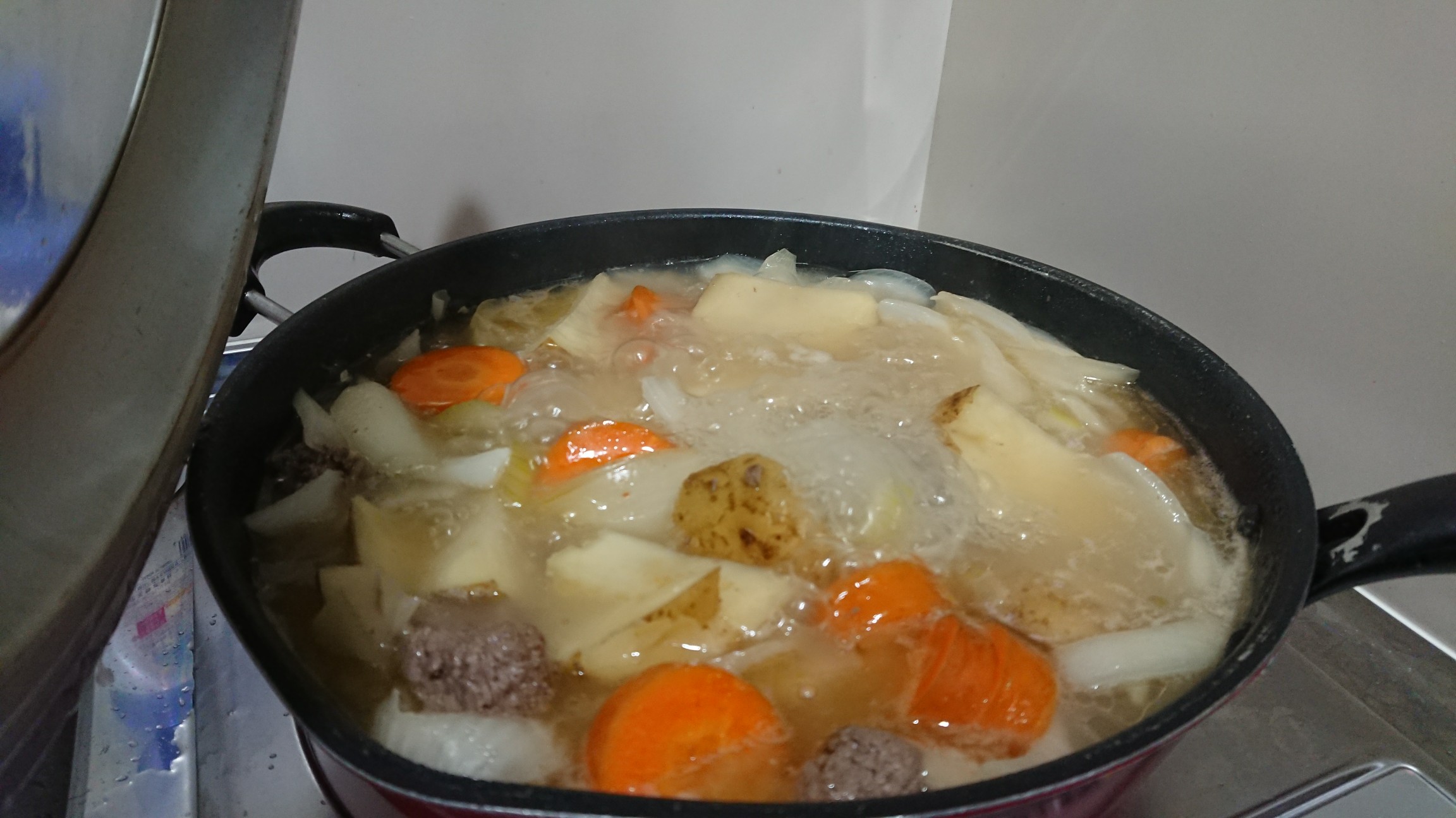 お肉は合い挽きミンチを解凍半ばでサイコロカット、「ダシダ」を出汁にして煮込み、ルーは甘口少なめにする。