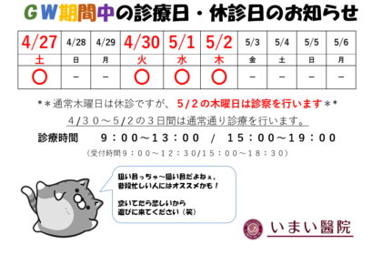 5月の連休は4月27日(土)30日(火)5月1日(水)2日(木)と診療致します。