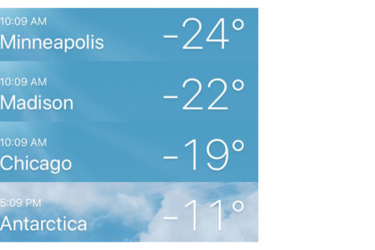 ミネアポリス -24℃、マディソン -22℃、シカゴ -19℃、南極 -11℃・・・